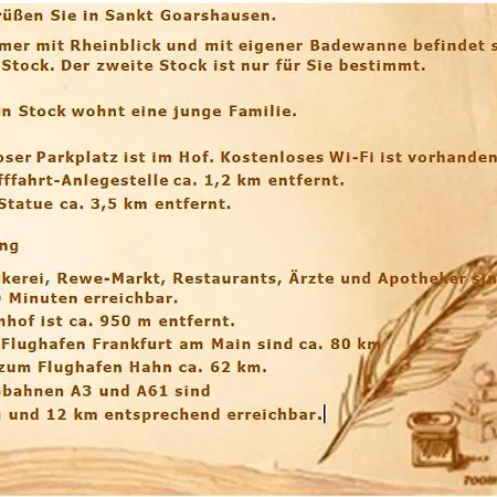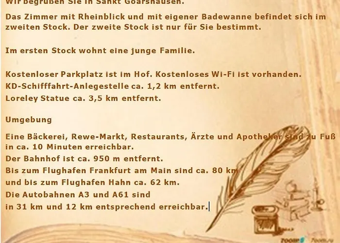 يحتوي مكان الإقامة على مرافق الخدمة الذاتية مثل المايكرويف والغلاية الكهربائية والبرَّاد لراحة الضيوف. وتشمل مرافق الخدمة الذاتية أيضًا معدات صنع القهوة والشاي. يقع بار النبيذ Secthaus Delicat على بُعد 13 دقائق مشياً على الأقدام. تقع Rheinblickzimmer على مسافة قريبة من محطة حافلات St. Goarshausen، Kindergarten.